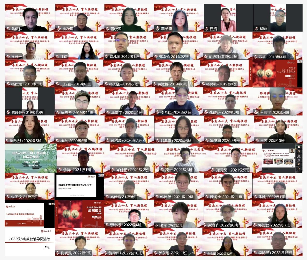 学院副院长陆俊林,党委副书记贾方健,教学办公室主任董晓晖,团委书记吕媛,辅导员范星盛、乔冠一、丁倩,以及学院2019-2022四个本科年级共计46位学生兼职辅导员参加了会议。因受疫情影响,会议从线下举办转为线上方式开展。大会由学院学生工作办公室主任李子奇主持。