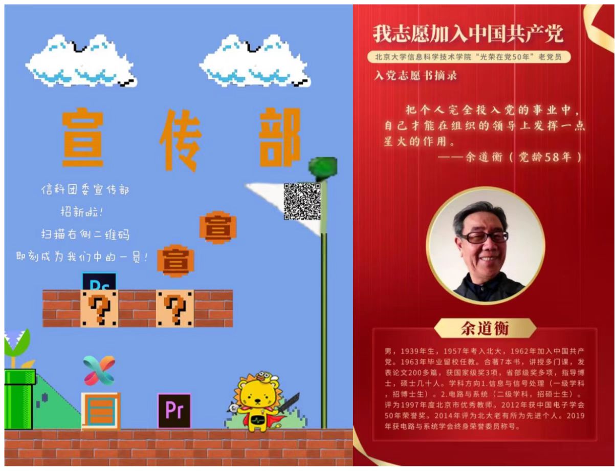 自2014年建立“北大信科团委”微信公众号,2016年信科公众号正式合并为“大信科”公众平台后,宣传部负责管理运营该微信平台,在平台上推出“E脉相传”、“E纸空文”等特色栏目,为信科同学们提供大学生活所需的各类信息和活动宣传。