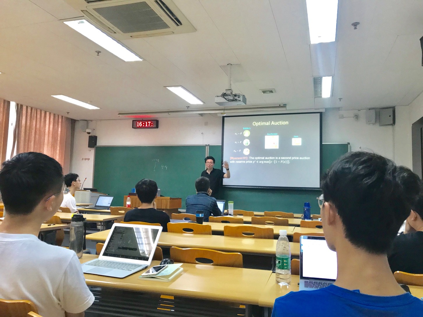 同学们都反映到老师的课程非常精彩,收获颇多;其中来自williamhill威廉希尔官网的周铭洵同学感言说:“蔡老师的课主要是讲述了算法博弈论和机器学习理论的一些基础,以及它们之间的紧密联系,比如双人零和博弈和线性规划的联系,以及和在线学习理论的联系,还有拍卖机制设计和机器学习中的复杂度的联系。能够在两个星期的时间里面学到这么多的内容,真的很不容易!往往在数学推导很多的课堂上,同学们都很容易迷失在繁杂的公式中,仅仅是知道了每一步公式的变化,但是却失去了对整体的把握。老师令我印象比较深刻的地方在于,很多知识点他能够用非常简洁的语言叙述清楚,直达知识点的本质,这让我受益匪浅。比如说线性规划的对偶,他也仅仅用了15分钟的时间就讲明白了。除此之外,蔡老师还非常注重课堂讲述的节奏,遇到较复杂的知识点,为了保证同学们能够理解透彻,他也会重复多次进行讲述,所以在两星期的课程中,即使课堂讲述的内容非常的有挑战性,我也能够比较好的follow到老师的节奏中。很感谢蔡老师的暑期课程!希望蔡老师能够开更多的课程!”