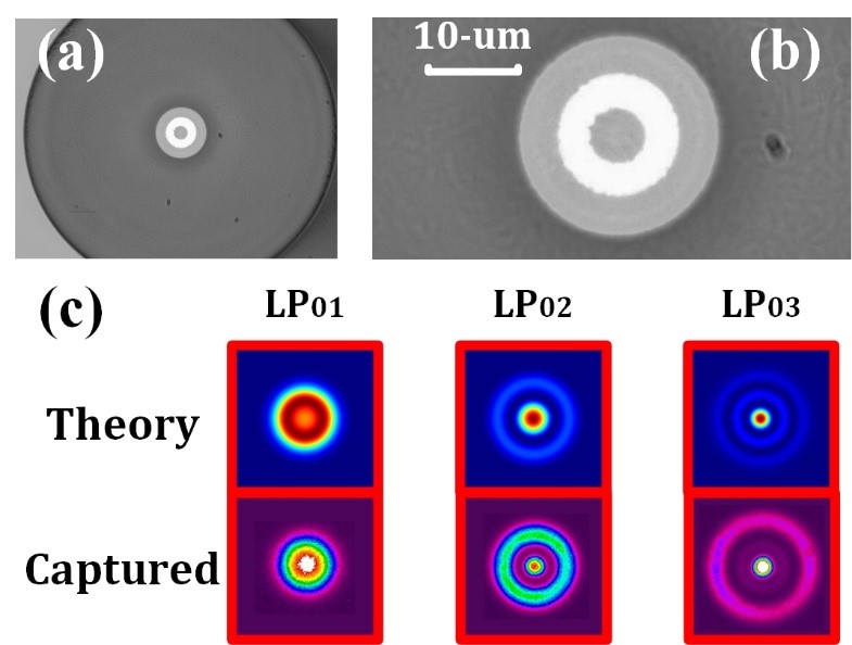 3 (a) 弱耦合十模光纤横截面;(b) 弱耦合十模光纤纤芯结构;(c) LP01LP02LP03模式模场图